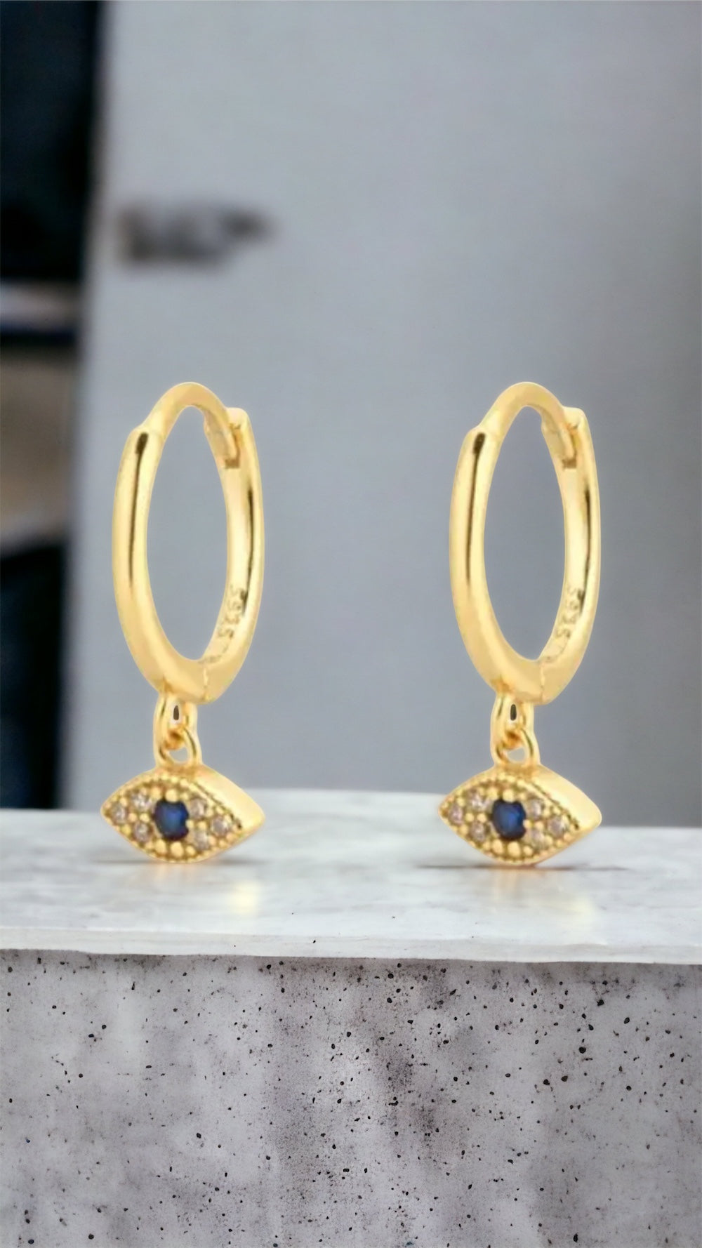 Each earring showcases a mesmerizing evil eye charm, encrusted with shimmering cubic zirconia stones. The vibrant blue eye serves as a talisman against negative energy, bringing luck, prosperity, and warding off any ill intentions.